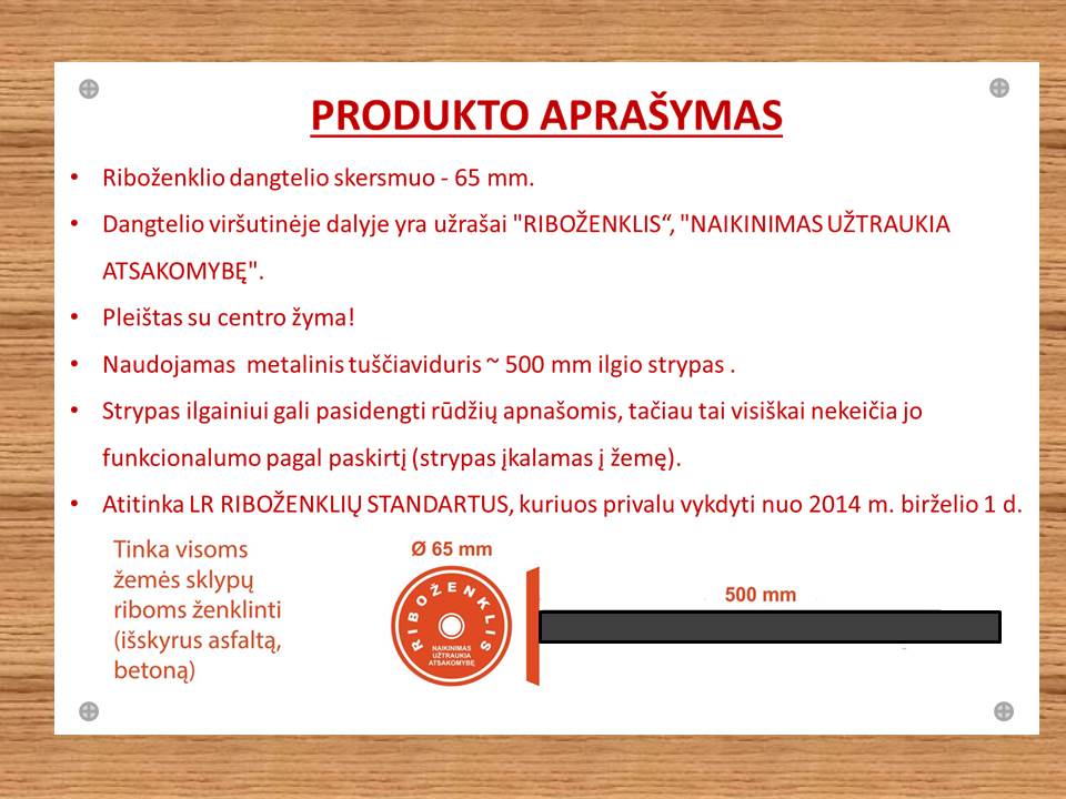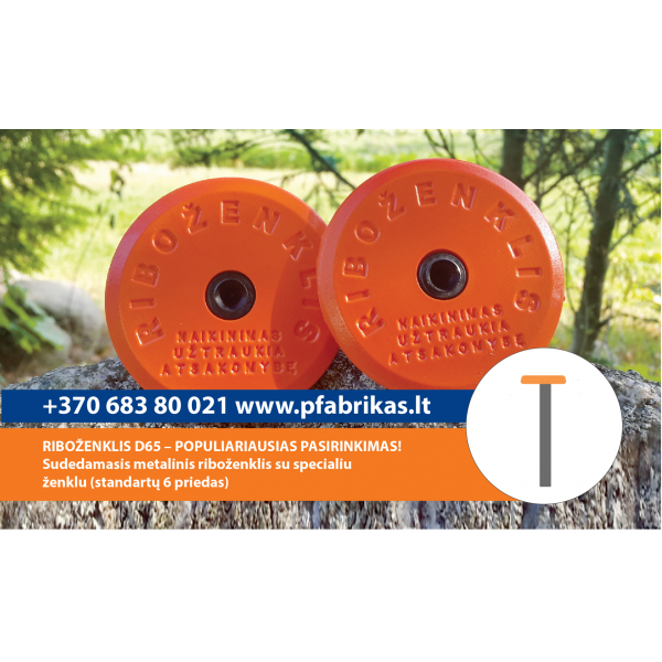1. Riboženklio D65 dangtelio skersmuo 65 mm. Dangtelio viršutinėje dalyje yra užrašas "RIBOŽENKLIS" "NAIKINIMAS UŽTRAUKIA ATSAKOMYBĘ".