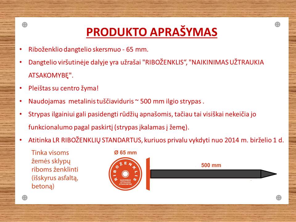 Riboženklį sudaro: Plastikinis ryškiaspalvis dangtelis D65 mm su pleištu, tuščiaviduris strypas su apsaugom nuo ištraukimo ir plastikinio smaigalio. Sukomplektuoto riboženklio aukštis ~ 50 cm.