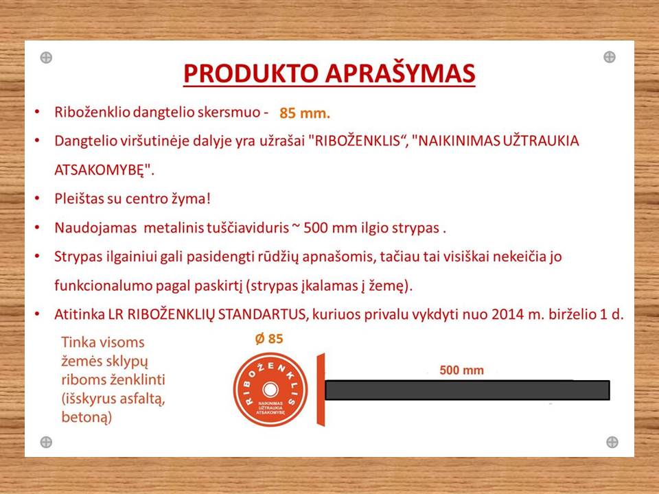 1. Riboženklio D85 dangtelio skersmuo ~ 85 mm. Dangtelio viršutinėje dalyje yra užrašas "RIBOŽENKLIS" "NAIKINIMAS UŽTRAUKIA ATSAKOMYBĘ".