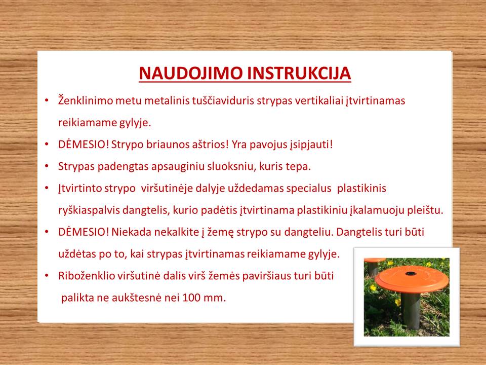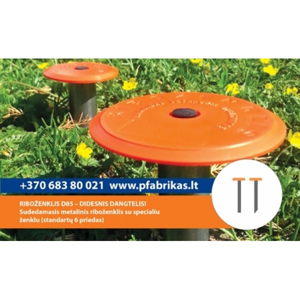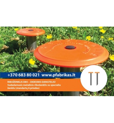 Didesnis dangtelis! Galima žymėti visų paskirčių žemės sklypų ribas, išskyrus sklypus kietomis dangomis (asfaltas, plytelės, betonas). Apvalus dangtelis leidžia riboženklį fiksuoti iki žemės paviršiaus - netrukdo šienauti, judėti transportui. Riboženklį sudaro: Plastikinis ryškiaspalvis dangtelis D85 mm su pleištu, tuščiaviduris strypas ir plastikinis smaigalis. Sukomplektuoto riboženklio aukštis ~ 50 cm.