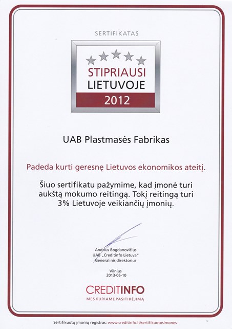 „Stipriausi Lietuvoje 2011" – specialus sertifikatas, kuris verslo partneriams ar klientams patvirtins, kad sertifikuotos įmonės yra patikimos ir laiku vykdo bei didelė tikimybė, jog vykdys savo finansinius įsipareigojimus. Tokių įmonių vertinimą atlieka ir sertifikatą suteikia kreditų biuras „Creditinfo". Remiantis dabartinėmis prognozėmis, griežtus sertifikato kriterijus atitinka tik 15 proc. iš 70 tūkst. veikiančių įmonių.